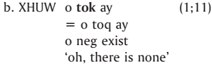 The examples in (21) show XHUW’s forms of existential negation. XHUW seems to have already mastered the use of the existential with ‘k’am’ and ‘toq’. She omits the existential correctly with ‘k’am’ in (21a) and produced the existential with ‘toq’ in (21b). These examples suggest that Q’anjob’al children acquire the constraint on the use of the existential in contexts of negation quite early.