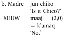 We provide examples of XHUW’s forms of discourse negation in (22). The exchange in (22a) shows the early use of ‘maj’ as a marker of discourse negation. The exchange in (22b) shows a form that was interpreted as a context for the use of ‘k’amaq’, but in which XHUW produced ‘maaj’. Since we lack evidence that vowel length was contrastive for XHUW, we interpret this exchange as a case where XHUW extended ‘maj’ to a yes/no question context where ‘k’amaq’ is obligatory.