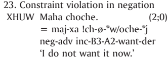 The error in (23) is interesting since it provides evidence that XHUW had to learn the constraints on verb inflection in the context of negation. Here, XHUW combines the negative marker ‘maj’ with a verb that has the incompletive aspect marker ch-. Another possibility is that XHUW used the discourse negation marker ‘maj’ in a context of clausal negation. This extension would explain why XHUW appears to violate the constraint on the use of the clausal form ‘maj’ with the aspect marker.