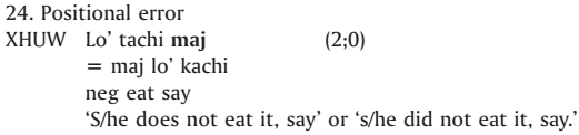 Finally, we observed an interesting case in which XHUW incorrectly places the negation marker ‘maj’ in final position rather than in initial position (24). This is another case in which XHUW has potentially extended the discourse negation form ‘maj’ to a context of clausal negation. In this case, a clausal negation marker should precede the verb ‘kachi’ as indicated by the English gloss. Her use of ‘maj’ after the verb ‘kachi’ is evidence that XHUW is using the discourse negation marker ‘maj’ as a form of clausal negation This example resembles the K’iche’ child’s use of ‘ta(j)’ in the initial position c), and suggests that Mayan children are open to the possibility of marking negation in either clause-initial or clause-final position.