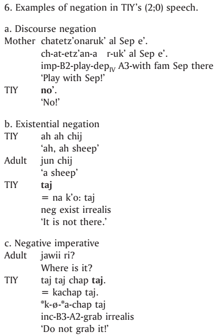 These examples show that TIY uses ‘no’ for discourse negation and the internal negation marker ‘ta(j)’ for clausal negation. The negative imperative example (6c) shows that she does not yet use the prefix form for imperative negation (m-). This form is optional in the adult grammar, but children consistently use ‘ta(j)’ for all forms of clausal negation. At first, K’iche’ children only use the second part of the negative circumfix, and only start producing the initial part when they are over three years old (id.).