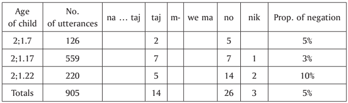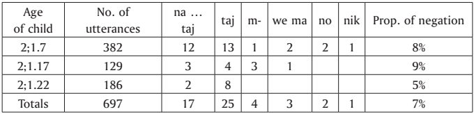 Table 1 shows that negation only occurred in 5 to 9 percent of the mother’s speech. The circumfix form of negation constituted 81 percent of the negation markers that TIY’s mother produced. Only 6 percent of her negative markers were the discourse forms no and nik. Table 1 shows that TIY’s mother omitted the initial part (na) of the circumfix in 25 utterances and produced the full circumfix in 17 utterances. She used the negative imperative prefix m- in 4 utterances.