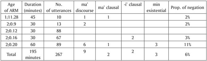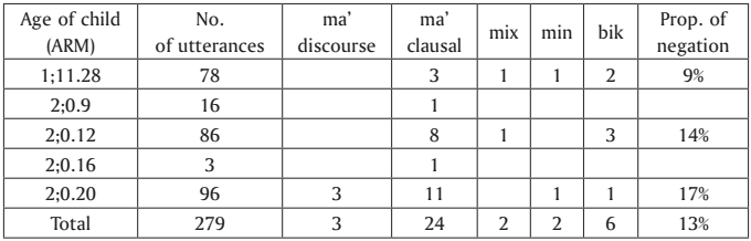 The analysis presented here is based on data from five recordings for a two-year-old boy ARM (Armando). In these recordings ARM interacts with his mother, two aunts and his cousin Sandi. ARM’s use of negation is shown in Table 5.
