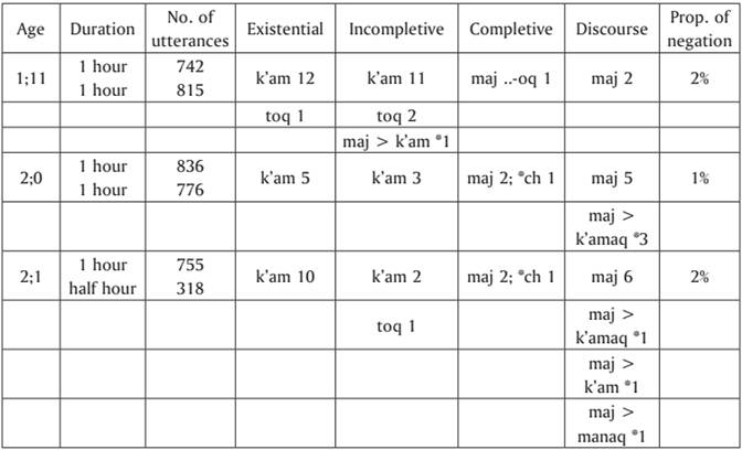The K’iche’ acquisition data were derived from three hours of recordings with the two-year-old girl TIY (Pye, 1992). The forms and frequency of negative marker frequencies in K’iche’ child speech are shown in Table 2.
