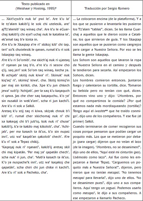 La tradición oral impregna también la naciente prosa k’iche’. El ojer tzij, “palabra antigua”, constituye el modelo discursivo por excelencia para los jóvenes escritores. Motivados por el purismo lingüístico que caracteriza al movimiento maya de hoy, la mayoría de escritores consideran a los géneros orales asociados con el poder de los ancianos y con los mitos de origen como qas qatzijob’al, “nuestra idioma en su expresión más pura” (Romero, 2015). Sus obras siguen las secuencias narrativas, personajes y metáforas emblemáticos de la tradición oral, además de evitar el uso de préstamos del castellano, frecuentes en los registros coloquiales. El texto que analizaré a continuación es un fragmento de uno de los cuentos premiados en el ‘Primer Concurso Literario en Lenguas Mayas P. Franz Tattenbach S. J.’ convocado en 1996 y publicado en 1997. Escrito por Eduardo León Chic, activista católico de Santa María Chiquimula, municipio del departamento de Totonicapán, es un relato de origen sobre Santa María Chiquimula y su patrona, la virgen María.
