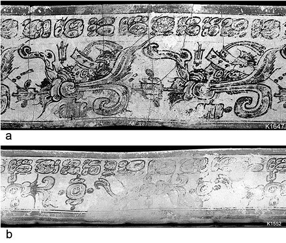Por otra parte, David Stuart (2013) ha sugerido que en algunas imágenes plasmadas en vasos del estilo códice, específicamente en las vasijas K1552 y K1647 (Figura 10), se encuentran referencias simbólicas vinculadas a Yuhkno’m Yich’aak K’ahk’ (gobernante del señorío de la Cabeza de Serpiente entre los años 686 a 697 d.C.) en asociación con la entidad de Chatahn. Aunque en ambos ejemplos el texto jeroglífico que acompaña a la imagen no hace referencia al poseedor de la vasija, el mismo Stuart menciona que podría tratarse de un personaje llamado Yopaat B’ahlam (que en otras piezas del estilo códice aparece relacionado con el título K’uhul Chatahn Winik) quien, presumiblemente, fue un gobernante local de Nakbé durante el Clásico Tardío, pudiendo ser este último asentamiento un aliado subordinado a Calakmul durante esa época.