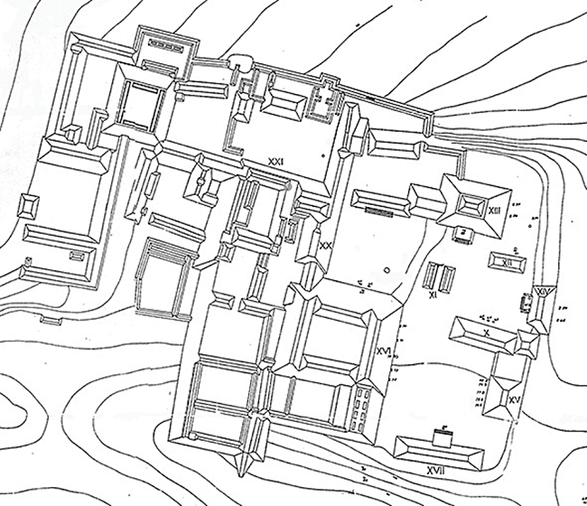 En este sentido, vale la pena tomar en cuenta los hallazgos de cerámica estilo códice en Calakmul, donde se han encontrado referencias a personajes de Chatahn, las cuales indican que el sitio pudo ser uno de los principales focos de producción de este tipo de cerámica (Boucher, 2014; Boucher y Palomo, 2012; Reents-Budet et al., 2010). Tal es el caso de una vasija encontrada en la Estructura XXI en la temporada 2012, donde se hace referencia a un individuo nombrado K’ahk’ Nahb’il K’uhul Chatahn Winik Sak Wahyis5 (Figura 11). Resulta interesante mencionar que una parte de esta vasija fue hallada en una unidad de excavación de la Estructura XXI (Salinas y Valencia, 2013), mientras que el otro tiesto fue recuperado en un pozo excavado en el pasillo norte localizado entre la Estructura G2 y la Estructura XX, en la Gran Acrópolis, lugar donde también se localizó la banqueta del otro Chatahn Winik que se ha mencionado antes (Boucher, 2014; Carrasco et al., 2005: 47-48). Ambos lugares se encuentran a una distancia aproximada de 30 metros (Figura 12), dando pie a plantearnos si los depósitos donde se localizaron ambas piezas eran basureros, o si en realidad tenían un carácter ritual. Lo interesante es que la Estructura XX parece ser el lugar donde los remanentes de esta dinastía temprana siguieron viviendo dentro de la ciudad, pues es el lugar donde más cerámica de este tipo se ha recuperado y donde se encuentra la banqueta de la cual ya hemos hablado.