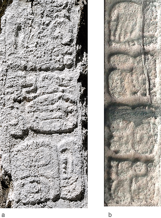 Posteriormente, Martin menciona la Estela 59, fechada en 741 d.C., en la que el primer cartucho legible, en la parte superior del texto, se asemeja a la figura de un murciélago (Figura 3 a). Después de una inspección detallada del monumento, podemos asegurar que se trata de un Glifo Emblema y que el único animal que tiene una oreja como la que claramente se puede ver en la Figura 3 a, y que además forma parte de un GE, es el murciélago. Asimismo, parece poseer los elementos circulares que se asemejan a los elementos iconográficos de la piedra que aparecen asociados al GE de Copán (Martin, 2005: 7), pero por su estado resulta muy difícil poder asegurarlo. La inscripción parece estar datada para el 9.15.10.0.0, 30 de junio de 741 d.C. (Martin, 1998), fecha asociada a otro conjunto de estelas localizadas frente a la Estructura VI. En su lado derecho, además de mostrar la fecha, parece incluir el sustantivo relacional, ukabaaj,2 ‘con la supervisión de’, antes del nombre del personaje asociado con el GE del murciélago, que indica la supervisión de dicha persona sobre la acción indicada por el verbo, la cual resulta muy difícil de leer. El texto del lado izquierdo incluye claramente una clausula verbal, CHUM-mu-ja, chuhmaj,3 ‘él se sentó’ (tercer grupo de signos en la Figura 3 a), indicando la acción de ascender al trono y también una referencia a un apelativo (9-CHAN/CHAK?) que aparece relacionado con el gobernante Bolon K’awiil en la Estela 58, localizada en el costado este de la Estructura XIII. En la Estela 59, dicho apelativo aparece precedido por la palabra AJAW-wa, ajaw, ‘gobernante’. Resulta claro que el GE del murciélago en tal caso no hace referencia a un gobernante de Calakmul, pues éste es mencionado en una clausula diferente. Para estos momentos, la historia de Copán es bastante convulsa, pues solo tres años antes, en el 738 d.C., Waxaklaju’n Ubaah K’awiil fue decapitado por su rival de Quiriguá, K’ahk’ Tihliw Chan Yopaat (Martin y Grube, 2008: 205), estando posiblemente involucrado en la conjura de Quiriguá contra Copán el gobernante anterior a Bolon K’awiil, Wamaw K’awiil (Martin y Grube, 2008: 114, 219), quien quizá también tuvo cierto control sobre el reino de Hix Witz (Tunesi, 2007). En resumen, si lo anterior es correcto, la estela parece mencionar un evento desconocido que fue supervisado por un personaje asociado al GE del murciélago y, posteriormente, menciona la entronización de Bolon K’awiil, estando ambos eventos probablemente relacionados.