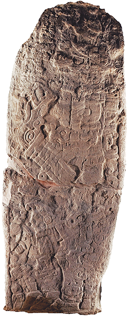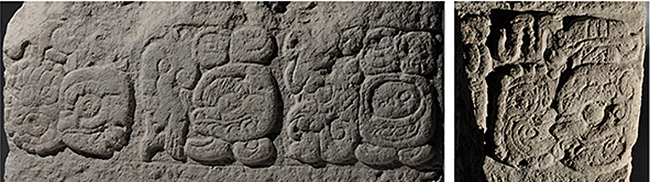 El último monumento que menciona Martin (2005) es la Estela 62, fechada en 751 d.C. y localizada actualmente en el Museo Nacional de Antropología de la Ciudad de México (Figura 3 b). El texto donde aparece el GE del murciélago se encuentra en la parte inferior derecha de la parte frontal de la estela. Su estado impide la realización de una lectura fiable, pero su contexto de aparición es el correcto, ya que al inicio de la oración se encuentra el verbo “esparcir”, por lo que en el texto debe seguir un nombre propio y algún título. Es imposible ver las características del GE de forma que se pueda comparar con el de Copán.
