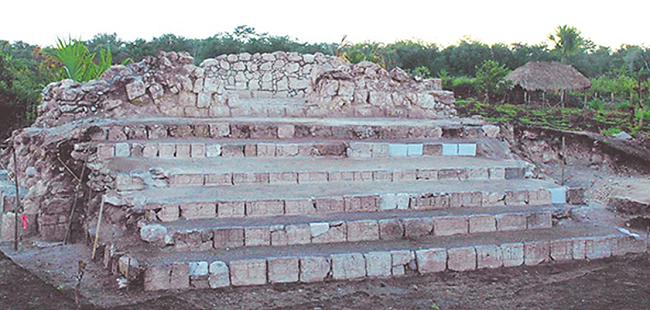 El hallazgo de la Escalera Jeroglífica del Grupo Guzmán de El Palmar (Figura 5) ha cambiado de alguna forma nuestra comprensión del empleo del GE del murciélago en la región central del Petén debido a que, por primera vez y de forma fidedigna, se identificó sin ambigüedades, encontrándose relacionado con uno de los jerarcas más prominentes de Copán, así como con las deidades protectoras de dicho asentamiento (Tsukamoto, 2014; Tsukamoto y Esparza, 2015).