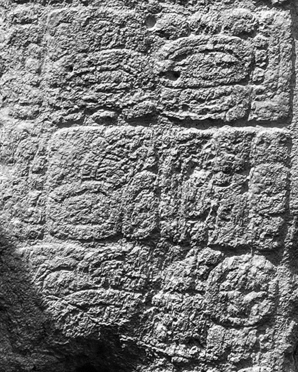 También la Estela 3, fechada en el 632 d.C. y pareada con la Estela 2, cuenta con otra mención a este GE, asociado a su vez con un título de kalo’mte’ y que, en opinión de Grube (2008: 219), parece ser un GE extranjero, no vinculado con Uxul, que bien podía estar asociado al gobernante mostrado en la Estela. Este es un ejemplo extraño, pues el GE va antecedido por el compuesto jeroglífico de kalo’mte’, siendo que lo común en esta región es escribir primero el GE y posteriormente dicho título. El otro monumento, la Estela 2, muestra a una mujer que aparece vinculada a los títulos K’uhul Chatahn Winik y Sak Wahyis.