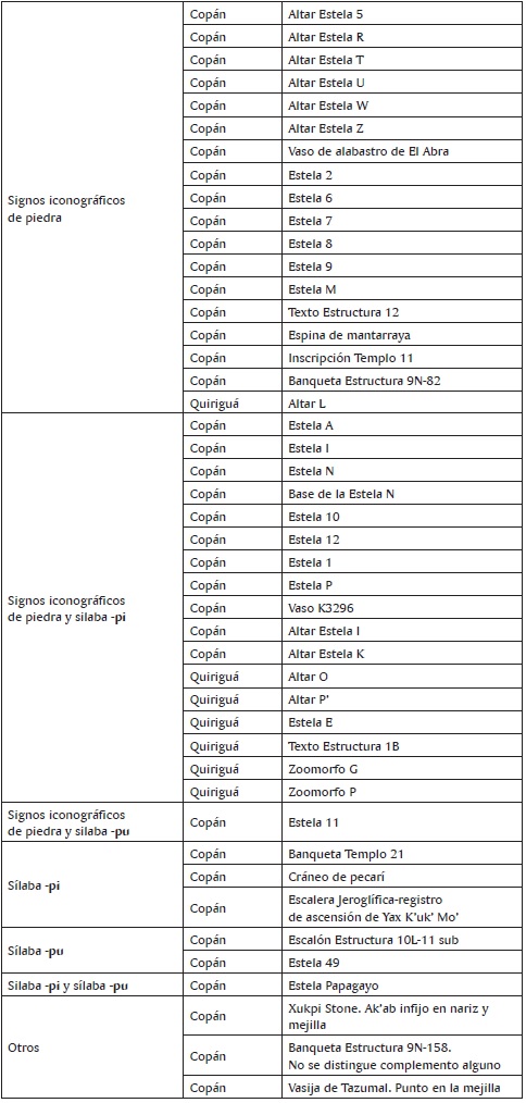 De 45 ejemplos del GE registrados en monumentos de Copán y de Quiriguá (ver Apéndice 1), 17 utilizan la cabeza del murciélago, o su cuerpo, con signos iconográficos de piedra; en otros 18 ejemplos además de los signos iconográficos de piedra se incluye el sufijo -pi; en un caso aparecen los signos iconográficos de piedra y el sufijo -pu; en otros seis la cabeza del murciélago aparece sin los signos iconográficos de piedra pero con complementos en -pi o en -pu, o ambos, y solamente hay tres ejemplos sin ninguno de estos atributos. Es decir, de los 45 ejemplos analizados, 42 presentan como características principales la presencia de los signos iconográficos de piedra y/o un sufijo (-pi o -pu), lo cual representa un 93% de los casos. De tres casos remanentes, uno muestra cierto grado de erosión (Banqueta Estructura 9N-158), otro es muy temprano (Estela Xukpí) y el otro procede de una región muy alejada del área maya (Vasija de Tazumal, Card y Zender, 2016). En los ejemplos en los que aparece el murciélago con los signos diagnósticos del logograma piedra cabría la posibilidad de que esto se debiera a una incorporación del silabograma -pi-, pero hemos visto que en un buen número de ejemplos aparecen ambos atributos del GE, por lo que ambas características son independientes.