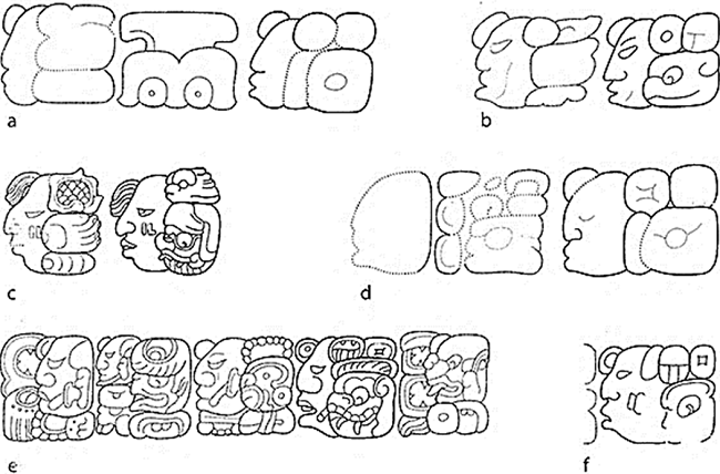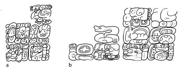 A pesar de que los datos presentados permiten, sin duda, cierto rango de interpretaciones, todo parece indicar que el GE de Kanu’l fue transmitido de manera patrilineal, de padres a hijos e hijas. La evidencia más clara proviene del Panel 6 de La Corona, donde la transmisión se refiere de manera explícita. Los demás casos comprueban que el GE no se transmitió de madres o esposas a sus hijos o esposos, respectivamente, ya que los hijos de las ixkanu’l ajaw llevan los GGEE de sus padres y nunca los de sus madres. Por ende, el uso del GE de Kanu’l fue exclusivo y no pudo ser pareado con otros,27 lo cual parece haber sido el paradigma más común entre los mayas del Clásico (Colas, 2004: 246-249). No obstante, en otras regiones del área maya, la combinación de GGEE fue una práctica frecuente, resultando en el uso de GGEE pareados en las frases nominales de los gobernantes. En varias ocasiones, las ocurrencias de glifos emblema pareados se han interpretado como resultados de la fusión de diferentes grupos de poder. Recientemente, se han publicado varios trabajos sobre estos casos (Biró, 2012; Gronemeyer, 2012; Helmke, 2012), así que aquí sólo discutimos algunos datos directamente relacionados con nuestra problemática.