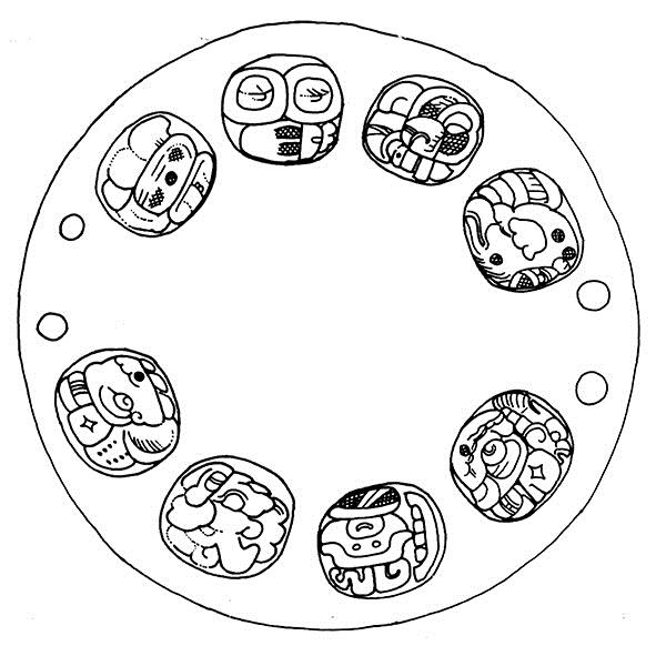 Los principios de la trasmisión del glifo emblema entre los miembros masculinos de los Kanu’l son, sorprendentemente, menos claros, al igual que la información sobre las relaciones de parentesco entre ellos. Existe solo un ejemplo textual en que un k’uhul kanu’l ajaw se relaciona directamente con su hijo. Se trata de un texto inscrito en un espejo de pizarra (Figura 4) del Clásico Temprano, cuyo dueño tiene el nombre […] Ch’e’n y lleva el título kan[u’l] ajaw, sin el adjetivo k’uhul ‘divino’. Además, se especifica que es hijo de Yax Yopaat, cuyo nombre aparece con el GE completo. Esto reafirma que los padres transmitían el GE a sus hijos, pero en principio sin el elemento k’uhul. El texto retrospectivo del Elemento 5 de La Corona parece repetir este patrón:20 se narra el nacimiento de yu[h]kno[’m] yihch’aak k’ahk’ kan[u’l] ajaw, lo que indica que por lo menos este gobernante llevaba el GE sin el adjetivo k’uhul desde su nacimiento. El adjetivo k’uhul parece haberse añadido al momento de tomar el poder (Colas, 2004: 241-242).