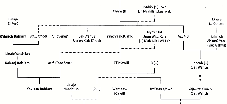 Existen dos posibles indicadores adicionales para la relación de parentesco entre los k’uhul kanu’l ajaw, pero son aún más problemáticos que los referidos arriba. En la Estela 3 de Pol Box, por un lado, se menciona a varios individuos Kanu’l con el epíteto mam (literalmente ‘abuelo’), pero en este contexto la expresión carece de marcas de posesión, así que la traducción ‘ancestro’ o ‘viejo’ como título honorífico o reverencial parece ser más adecuada (Esparza y Pérez, 2009: 9, nota de pie 6, 11; Lacadena, 2016). Por otro lado, algunas inscripciones del Clásico Tardío incluyen una cuenta dinástica que aparentemente empezaba con Ch’e’n II en la segunda mitad del siglo VII, pero este tipo de expresiones no necesariamente implican una relación parental entre los sucesores, y la aparente ruptura entre el reinado de Ch’e’n y su antecesor sigue siendo poco entendida (Martin, 2005: 7-8; para nuevas evidencias sobre la división dinástica ver Helmke y Awe, 2016b; Martin y Velásquez, 2016).