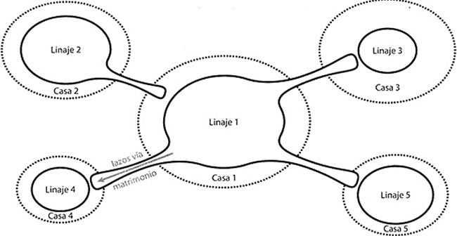 Por otro lado, Claude Lévi-Strauss define a la casa como una “persona moral detentadora de una propiedad -material e inmaterial-, que se perpetúa por la transmisión de sus nombres, de su fortuna y de sus títulos en línea real o ficticia, tenida por legítima con la sola condición de que dicha continuidad pueda expresarse en el lenguaje del parentesco -real o ficticio- o de la alianza -matrimonial o adopción- y, lo más a menudo, de los dos juntos” (Lévi-Strauss, 1986: 180). Aquí cabe aclarar que existen sistemas con características patrilineales marcadas que tienden a dar preferencia a las mujeres lineales sobre los varones colaterales cuando se trata del manejo de la herencia o de la sucesión,6 lo que ha sido denominado por algunos autores como linaje atenuado (Augustins, 1989; Robichaux, 2005). Al concepto de casa se asocia el de grupo corporativo, que ha recibido la atención de muchos antropólogos desde 1861, cuando Sir Henry Maine acuñó el término. Desde entonces ha sido objeto de redefiniciones continuas. A grandes rasgos podríamos decir que el grupo corporativo corresponde a un grupo de personas estable, selectivo y duradero que comparte colectivamente una propiedad, derechos, privilegios y/o responsabilidades; que tiene una identidad grupal bien definida y que tiene líderes (Maine, 1861; Honigmann, 1959: 360; para una discusión más amplia ver Hayden y Cannon, 1982).