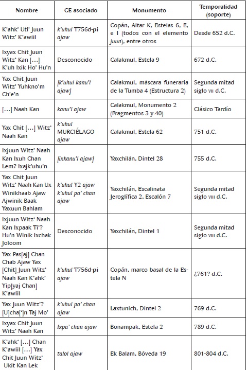 La Tabla 1 muestra la distribución de nombres que incluyen el nombre de la Serpiente Acuática Yax Chit Juun Witz’ Naah Kan, o partes de él, en el Clásico (Colas, 2004: 263-264; Zamora Moya, s.f.). El primer ejemplo claro no proviene del Petén, sino de Copán. El nombre del decimosegundo gobernante de este sitio se escribe en varios monumentos como K’AK’ u-TI’ HUN-WITZ’ K’AWIL y probablemente debe transcribirse k’ahk’ uti’ [j]uun22witz’ k’awiil,23 lo que literalmente se puede traducir como ‘fuego es la boca de Uno Agua Movida-K’awiil’ o ‘fuego es la boca del K’awiil Acuático’. No obstante, poco después empieza a aparecer el nombre de este ser como teónimo facultativo en los nombres de individuos mencionados en Calakmul. En ello, es interesante notar que no sólo los Kanu’l emplearon tal segmento nominal, sino por lo menos dos individuos más. El primero es la mujer representada en el costado posterior de la Estela 9 de Calakmul (Ruppert y Denison, 1943: lámina 48c; Marcus, 1987: 80), la cual probablemente fue la esposa del gobernante Yihch’aak K’ahk’. Su nombre propio incluye, además, el elemento 5-HUN-na (ho’ hu’n), mismo que aparece en el nombre de una mujer en el Panel 6 de La Corona, por lo cual se ha propuesto que se trata de la misma persona (Vázquez López, 2015: 188-189). En el Panel 6, la señora Ho’ Hu’n está parada en un santuario de la serpiente acuática, lo que expresa su vínculo íntimo con esta deidad. Ni en el texto de Calakmul, ni en el de La Corona se logra distinguir un GE relacionado con dicho individuo, así que probablemente no era miembro de los Kanu’l. El segundo personaje con el nombre de la Serpiente Acuática que se menciona en Calakmul, sin formar parte de los Kanu’l, es el gobernante Yax Chit […] Witz’ Naah Kan, quien gobernó a mediados del siglo VIII (Martin y Grube, 2008: 112, 115) y portaba el GE de Cabeza de Murciélago (Martin, 2005: 5).