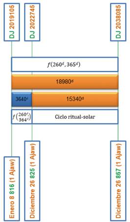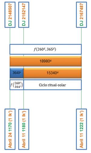 El intervalo obtenido corresponde en consecuencia a 18980d - 3640d = 15340d, y puede ser expresado en función, tanto del ciclo ritual, como del año solar, a través de la relación de correspondencia 59 x 260d = 42 años solares.