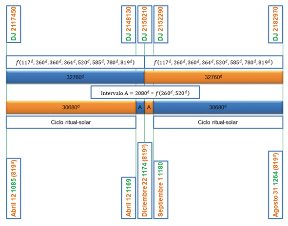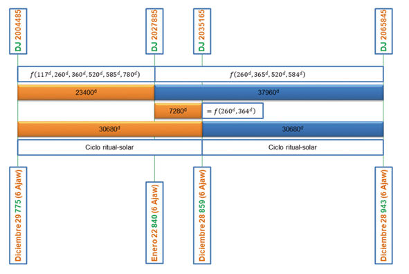 Se considera que los intervalos de 37960d y 23400d son significativos porque, al igual que el intervalo de 7280d, pueden ser expresados en función de ciclos mayas reconocidos, como 117d, 260d, 360d, 365d, 584d y 585d. Condición que aquí se cumple, ya que 37960d es función de 260d, 365d y 584d; mientras 23400d es función de 117d, 360d y 585d (ver Figura 7).