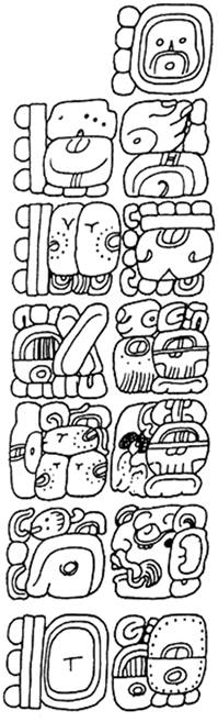 Ahora bien, sabemos por inscripciones epigráficas que los mayas del período Clásico equiparaban la fecha del "fin de período" anterior con el "asiento" u origen del período en curso (ver Figura 2, donde la inscripción cronológica de Palenque 13.0.1.9.2 13 Ik’ homologaba la fecha 20 Mol del ciclo anterior con el origen 0 Ch’en del ciclo en curso).