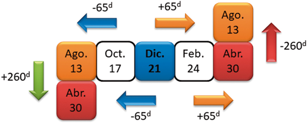 A partir del solsticio de invierno de diciembre 21 -la referencia natural de origen más probable del calendario solar maya- (Bricker, 1982; Tichy, 1991; Sánchez y Šprajc, 2015: 89 s.), se adicionan y sustraen intervalos múltiplos de 65d, procediendo a registrar las fechas solares obtenidas dentro de un sistema coordenado en donde cada unidad básica de desplazamiento representa 65d en la escala horizontal, y 260d en la escala vertical (Figura 3). Bajo este tipo de ordenamiento, el avance del tiempo se define siguiendo la direccionalidad de la lectura (de izquierda a derecha y de arriba hacia abajo). La distribución simétrica de celdas en torno al solsticio de referencia facilita la identificación de patrones de distancia.