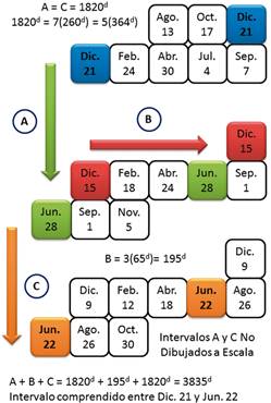 En ese orden de ideas, la distancia que separa los solsticios de invierno y verano (Figura 4a) será de 1820d + 3(65d) + 1820d = 3835d, debido a que: