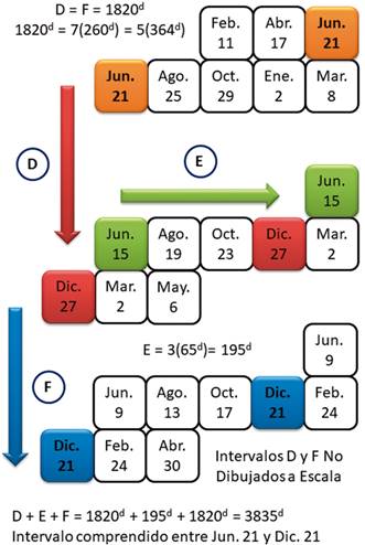 El intervalo de separación de 3835d entre fechas opuestas-complementarias puede ser establecido con facilidad a través de dos conjuntos de "fechas de enlace" distanciadas por 7 x 260d = 5 x 364d = 1820d, del entorno inmediato de ambos solsticios (o de las demás fechas que conforman el sistema).