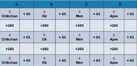 La estructura de este almanaque -delineado en el sector central de las páginas 30 y 31 del Códice de Dresde- se ilustra en la Tabla 1, en donde sendos intervalos de 65d separan las fechas 8 Chikchan, 8 Ok, 8 Men y 8 Ajaw del ciclo ritual. El Número de Distancia de 65d que, desde 8 Ajaw conduce hacia 8 Chikchan, representa el completamiento de un ciclo ritual de 260d, a partir del cual, la secuencia descrita por la estructura del almanaque D.30b-31b podría repetirse ad infinitum. Para fines de diferenciación, las sucesivas fechas 8 Chikchan, así obtenidas, podrían registrase en renglones consecutivos, bajo una misma columna.