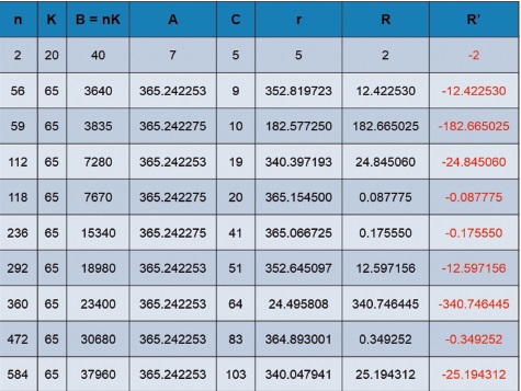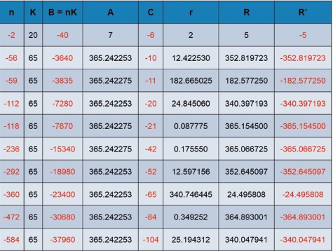 Donde r y R’ representan las soluciones positiva y negativa del sistema, es decir, las posiciones en adelanto y en atraso del intervalo (B) múltiplo de 65d, respecto del año trópico real (A). Estos resultados indican, por tanto, que han transcurrido 20 años solares (C), más la fracción 365.1545d (r), y que tan solo falta -pues así lo indica el signo negativo del valor de R’- una fracción de 0.087775d para completar el ciclo siguiente (el vigésimo primero).