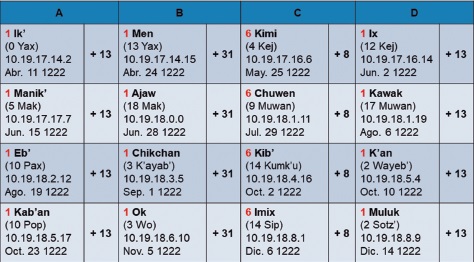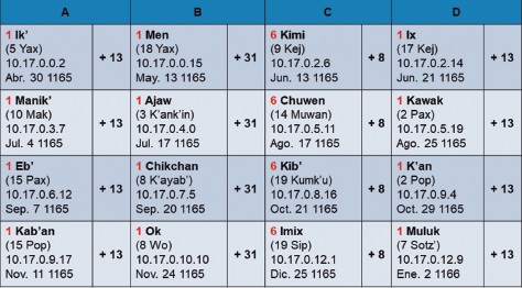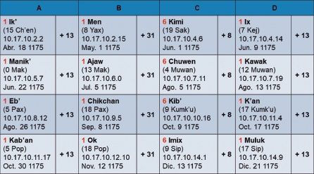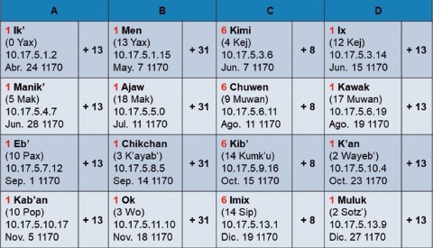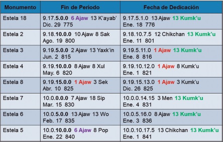 En las estelas bajo estudio (Tabla 7), el cumplimiento de los intervalos de 5 x 364d = 7 x 260d = 1820d coincide con fechas de dedicación 1 Ajaw de la cuenta ritual, y los ciclos de 5 x 365d = 1825d concuerdan con registros 13 Kumk’u del calendario Jaab’. Para facilitar su identificación en la Tabla 7, las fechas 1 Ajaw han sido destacadas en rojo, y las dataciones 13 Kumk’u, en verde.