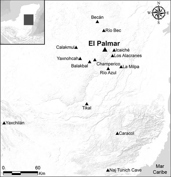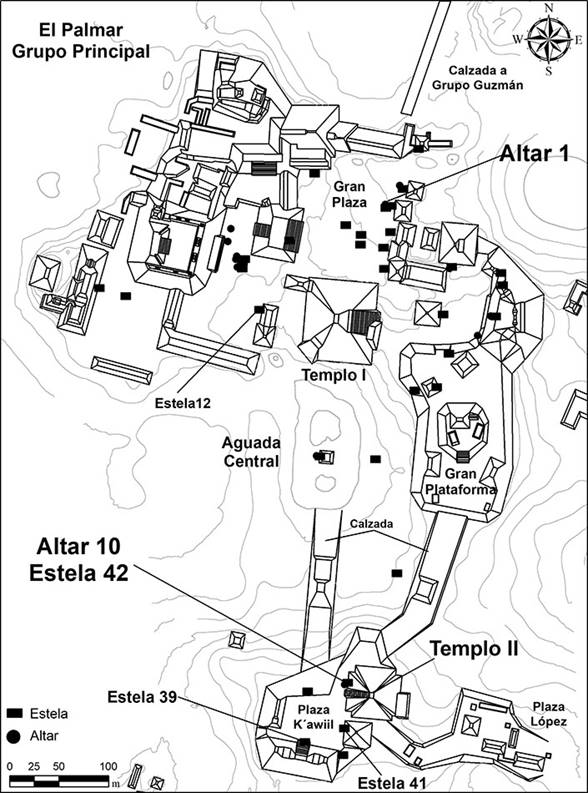 El Palmar se localiza en la región sur del estado de Campeche, México, cerca de otros grandes asentamientos arqueológicos como Calakmul, Becán, Río Bec, Río Azul, La Milpa y Yaxnohcah, en un área de transición entre los estilos Petén y Río Bec (Mapa 1). Los grupos arquitectónicos se extienden en un área de 94 km2, siendo el Grupo Principal uno de los más relevantes al encontrarse constituido por varias estructuras monumentales distribuidas en una planicie de un kilómetro cuadrado (Mapa 2). Durante los recorridos de superficie efectuados de 2007 a 2018 se han detectado más de 50 monumentos esculpidos en diferentes sectores del asentamiento, de los cuales, 35 estelas y 14 altares se ubican en el grupo antes mencionado.