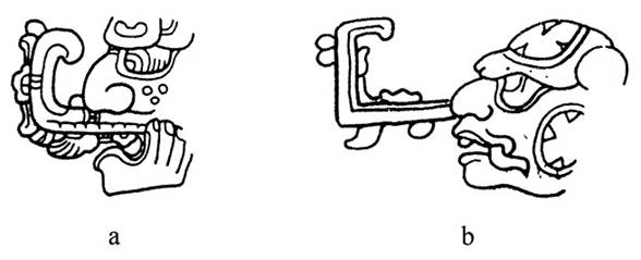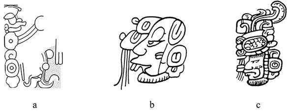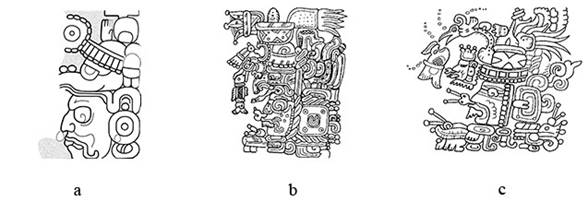 Teniendo en mente la presencia del Dios GI, es posible especular que este individuo también sea una deidad, pero su identificación resulta problemática. Quizás se trata del Dios del Maíz, ya que en varias representaciones suyas del Clásico Temprano se pueden apreciar muchos de los elementos que porta la testa grabada en el altar, aunque la imagen del ser narigudo que lleva en el tocado no es usual (Figura 7). Si este elemento está relacionado con su nombre, al igual que en el caso de GI, entonces podría pensarse que se trata de un logograma de lectura incierta, al no apreciarse con claridad todos los elementos del texto, pero bajo este supuesto sería difícil relacionarlo con el Dios del Maíz.