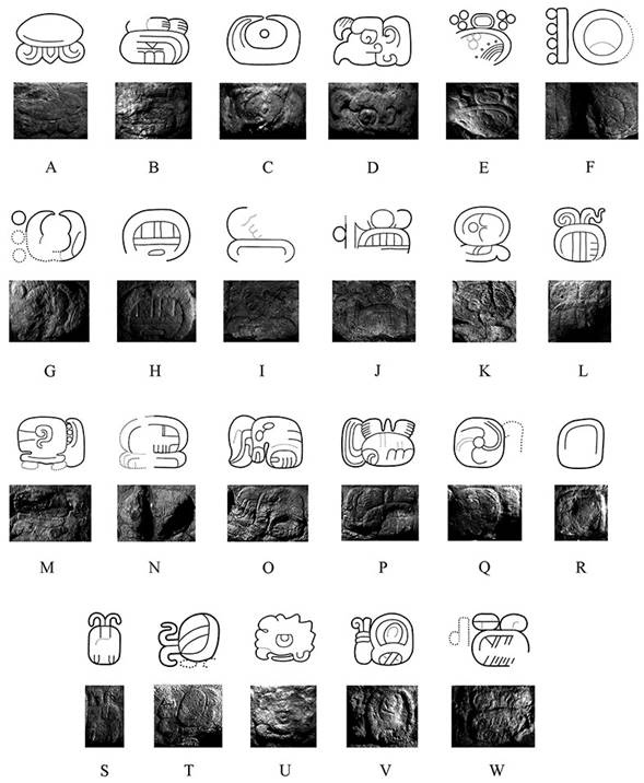 (A) AL?-ya (B) PAT (C) ja (D) u (E) ?-TUN (F) 9-AJAW (G) 3-WAY (H) HAB (I) TZUTZ-yi? (J) 6-WINIKHAB (K) ILA-ji (L) K’AK’ (M) P’UL?-la-ja (N) CHAN-na (O) YOP-AT (P) ja?-ta-ma (Q)?-? (R) ? (S) ? (T) K’AWIL-la (U) TOK’? (V) SAK-o (W) 6-PIT-AJAW