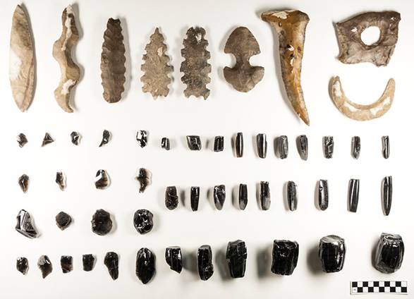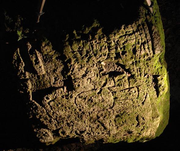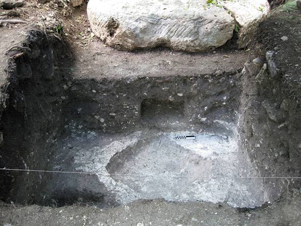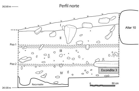 Durante la temporada de campo de 2009 se realizó un sondeo (Operación TP5) en el costado poniente del Altar 10, con la finalidad de obtener datos asociados a su contexto arqueológico. Si bien la excavación alcanzó el contacto natural a los 130 cm, solo fue posible identificar el firme de un piso deteriorado en el desplante del monumento, aunque quizás los pisos superiores fueron alterados por actividades modernas, incluyendo la remoción de material orgánico efectuada en 1984. No obstante, esta excavación expuso un par de lajas de piedra que cubrían una ofrenda (Escondite 3) compuesta por un total de 53 artefactos líticos, los cuales aparecieron superpuestos en un área de 30 por 40 cm y 15 de espesor (Tsukamoto, Kotegawa y Campaña, 2012; Mapa 1); nueve excéntricos de pedernal, así como 25 núcleos y 19 lascas de obsidiana integraban el depósito (Figura 2). Los excéntricos exhiben formas semejantes a las de una serpiente, un ciempiés, una creciente lunar y un cetro maniquí, entre otras, siendo similares a los recuperados por Eric Thompson en una ofrenda (cache) asociada a la Estela 10, ubicada en el sector noroeste de la Gran Plaza del Grupo Principal (Thompson, 1936b: 126). Una vez concluida la excavación, casi al nivel del material parental, se observó una horadación romboidal de 87 por 84 cm en el centro del límite oriental del sondeo (Figura 3).