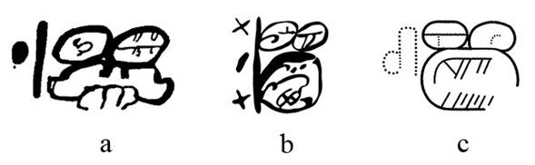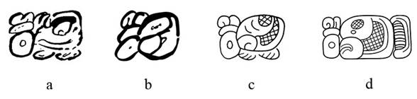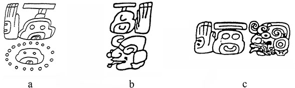 En este sentido, se destaca el rostro colocado en el extremo inferior derecho de la composición, que corresponde sin lugar a duda a la representación del Dios GI.4 La identificación de esta deidad se encuentra sustentada en la presencia de diversos elementos iconográficos, así como en el breve texto jeroglífico colocado en la parte alta de su tocado. Aquí, el teónimo se encuentra conformado por un signo con forma de mano extendida,5 el logograma NAH y un tercer jeroglífico similar al del logograma AJAW. Esta variante se halla representada en los textos del periodo Clásico Temprano procedentes de la región del Petén (Stuart, 2010; Figura 5), a diferencia de una segunda variante que se encuentra ampliamente escrita en inscripciones de Palenque y que David Freidel, Linda Schele y Joy Parker (1999) leyeron como Hun Nal Ye, ‘Uno Maíz Revelado’,6 vinculándola así con un aspecto del Dios del Maíz. No se ha llegado a un consenso sobre cuál es la lectura correcta de su nombre en ambos casos (Stuart, 2010; Tuszyńska, 2009; Wagner, 2017), aunque la vasta documentación que existe de las dos variantes en diversas inscripciones permite vincularlas sin ambigüedad con el Dios GI.