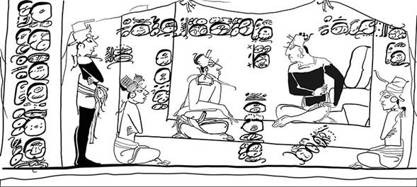 Esta hipótesis encuentra sustento en algunos ejemplos donde el título Sakho’ok se vincula con más de un individuo, por lo que no fue utilizado de forma exclusiva por los reyes en turno. En este caso, destaca la vasija conocida como El Señor del Petén (Cortés de Brasdefer, 1996; Figura 12), que contiene una escena palaciega donde se observa la presencia de cinco individuos, dos de ellos portando el conocido título ajk’uhu’n, "sacerdote, adorador" (Lacadena, 2010; Zender, 2004), otro más que parece ser un noble heredero ya que un breve texto lo identifica como un baahtz’am ch’ok, "joven primero del trono", mientras que los otros dos ostentan el título sakho’ok. De estos últimos personajes uno parece ser el gobernante de El Palmar, ya que de forma adicional lleva los títulos de baahkab, "primero de la tierra" y wak piit ajaw, el título toponímico vinculado con la entidad política de El Palmar. Esto es interesante ya que, si bien a dos individuos en la misma escena se les refiere como sakho’ok, no sucede así con el título wak piit ajaw, reservado sólo para el soberano (Tsukamoto y Esparza, en revisión).