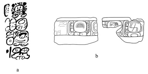 Un caso similar se puede apreciar en la extensa inscripción de la Escalera Jeroglífica del Grupo Guzmán, que contiene una narrativa referente al lakam Ajpach’ Waal (Tsukamoto y Esparza, 2015). En este texto se hace referencia a sus antepasados como parte del mismo linaje lakam, señalando que sirvieron a diferentes gobernantes de El Palmar, como Upakal K’ihnich, quien en la escalera jeroglífica sólo porta el título sakho’ok, pero que en un texto de la cueva de Naj Tunich se le confiere también el título de wak piit ajaw (MacLeod y Stone, 1995; Figura 13). Este hecho puede ser explicado si se considera que sólo el soberano en turno tenía el derecho legítimo de portar dicho título, hipótesis que cobra fuerza si se toma en cuenta que en la escalera jeroglífica únicamente el señor Yunen, el rey en funciones cuando fue construida la escalinata en el año 726 d.C., es un wak piit ajaw (Tsukamoto y Esparza, en revisión).