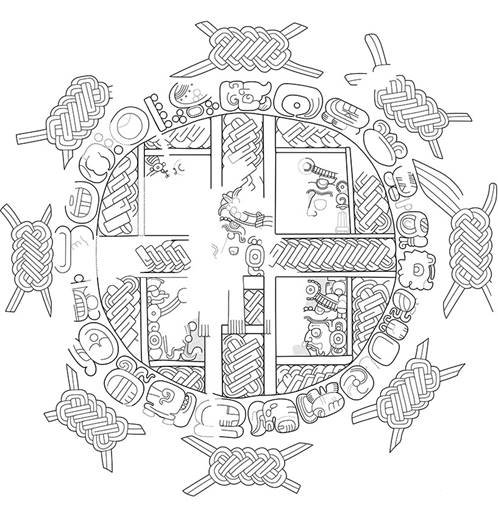 El grabado en la cara frontal del altar se divide en cuatro secciones delimitadas por bandas en cruz que contienen diseños de estera o petate, un símbolo relacionado con el poder real de los gobernantes mayas del Clásico. A partir de este arreglo primario, se distinguen cuatro secciones rectangulares que enmarcan los rostros en perfil de sendos personajes, integrándose una quinta testa en el centro de la composición (Figura 4). Debido a la fractura del monumento y a las áreas erosionadas en su superficie es difícil establecer con certeza la identidad de esos seres, pero elementos diagnósticos aún visibles permiten plantear algunas hipótesis.