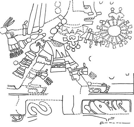 Por otra parte, si bien este mural puede representar una conquista, es posible que también transmita parte de lo que ocurría en el rito, pues en él se realizaban ciertos bailes. Aunque Las Casas no específica de qué tipo, se puede sospechar que estaban relacionados con temas guerreros y que el ajpop participaba en ellos. Recuérdese que el Título K’oyoi (2008: 36) menciona una danza de la guerra acompañada por las flautas de los señores. En el caso del mural no se ve dicho instrumento, pero sí una sonaja.