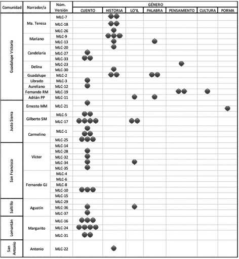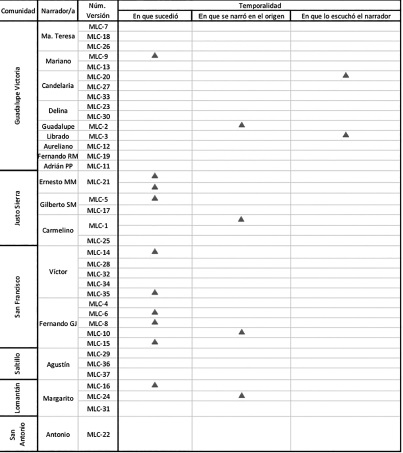 En dos estructuras formulísticas que ya se han mencionado, los narradores dicen que el relato les fue contado “ja najate’”, ‘en el pasado’ (MLC-3 y MLC-20). En definitiva, se podría decir que la antigüedad del relato parece ser relevante y otorga (o refuerza) al acto narrativo como un acto que toca con el origen y, por ello, está dotado de cierta sacralidad. Se podrían resumir las menciones a la temporalidad en el siguiente cuadro (Cuadro 4), en el que cada símbolo representa el modo en que se expresa la temporalidad (cuando se expresa) en cada versión: