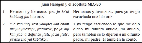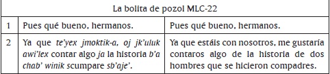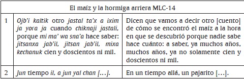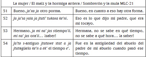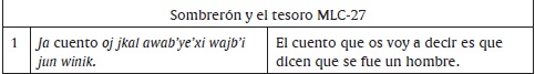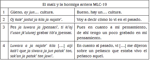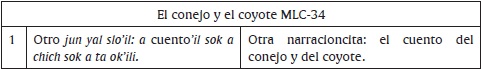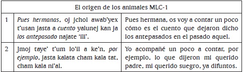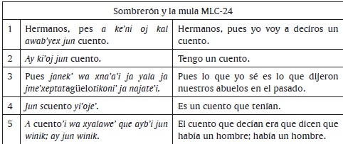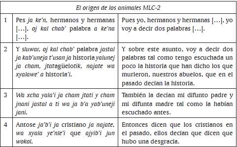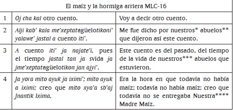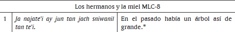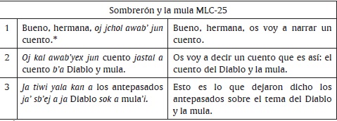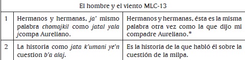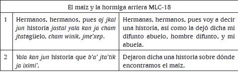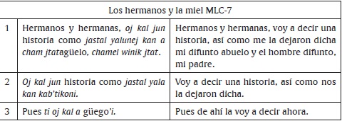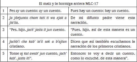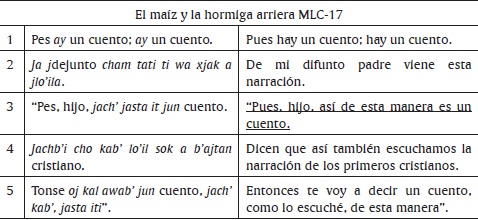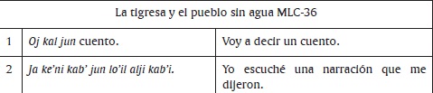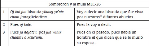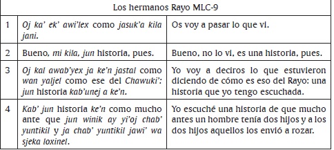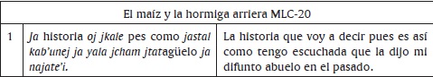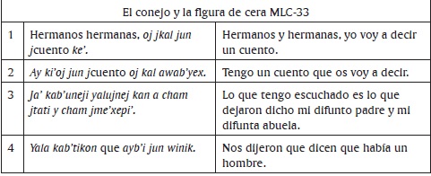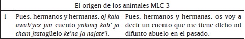 En este caso vemos una elaboración breve de la estructura formulística de apertura, pues el narrador que emitió este texto ya había narrado varios previamente de considerable duración, pese a que en ninguno de ellos fue mucho más extenso en sus fórmulas de apertura y cierre. Vemos, además, cómo utiliza el diminutivo yal que modifica a lo’il.