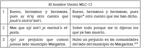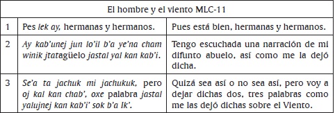 Es esperable que, si los hechos que nos narran no han sido vistos por los propios ojos de los narradores que los reproducen, éstos mencionen la fidelidad de su reproducción, el intento de ajustarse a lo que ellos escucharon. En todas las versiones en que hacen esto afirman que van a decir el relato tal y como lo escucharon (“jastal yal kan kab’i” o ‘así como me la dejó dicha’), menos en una versión, MLC-11, arriba mencionada, donde el propio narrador muestra la duda de la fidelidad de su reproducción: “Se’a ta jachuk mi jachukuk, pero oj kal kan chab’, oxe palabra jastal yalujnej kan kab’i’ sok b’a Ik’”, que quiere decir “Quizá fue así o no fue así, pero voy a dejar dichas dos, tres palabras como me las dejó dichas sobre el Viento”.