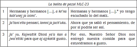Esta estructura de apertura es un ejemplo de cómo la situación contextual influyó en la emisión: en el primer segmento la narradora interrumpe su emisión al recordar que se le debía decir su nombre antes de comenzar; antes de terminar este primer segmento, otra narradora la interrumpe de nuevo para recordarle que también debe decir su comunidad. Sin embargo, vemos que a continuación la narradora vuelve a mencionar, con la misma fórmula (“chab’ palabra”) el género de su emisión, lo que refuerza nuestra hipótesis de obligatoriedad. En el tercero de los casos en que se utiliza otra realización de esta fórmula, más compleja (“chab’, oxe palabra”), ésta se combina con lo’il en lugar de con ‘historia’, como las dos anteriores (14):