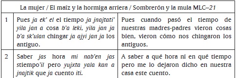 En esta estructura formulística, podemos apreciar cómo el narrador, cuando dice “nuestros abuelos” utiliza el plural excluyente -tikon, lo que quiere decir que en ese momento la interlocutora principal no está incluida en ese ‘nosotros’, que no son de ella esos ‘antepasados’. Tenemos aquí la explicitación de la conciencia de la comunidad cultural tojolabal a la que pertenece y su diferencia respecto a alguien no tojolabal. Puede encontrarse este plural en más ocasiones que se señalarán con nota al pie. Eso se refuerza con el hecho de que utilice el término “hermano” para dirigirse a la persona que realiza la entrevista (¿entre otros?) al referirse a su auditorio, pues no tenemos relaciones de consanguineidad. Por otra parte, el término tojolabal que hemos traducido por “nuestros abuelos” está compuesto por las palabras “abuela” (me’xep), en primera posición, y “abuelo” (tatagüelo), en segunda. Una traducción muy literal sería, entonces “abuelas-abuelos”. En definitiva, para resumir las variaciones de todos los textos respecto de este elemento, el cuadro quedaría como sigue: (Cuadro 1)