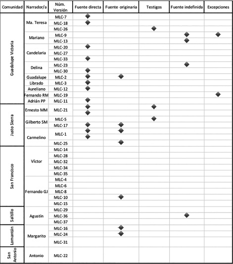 En definitiva, podemos afirmar que en las estructuras formulísticas de apertura es relevante o necesaria la explicitación de que el relato que se narra proviene de una fuente distinta al propio narrador, que no fue testigo de los hechos. Relevante también parece ser la mención de la fuente directa de éste, que en casi todos los casos es un familiar. La historia cobra cierto tono solemne cuando se menciona que proviene de los antepasados y, quizá también, cierto valor sagrado y carácter fehaciente. El hecho de que los antepasados sean la fuente originaria le da autoridad al narrador que reproduce el relato importante. Se pueden resumir los resultados de este análisis en el siguiente cuadro, en el que se señala con un símbolo el tipo de fuente a la que se alude en cada versión (Cuadro 3):