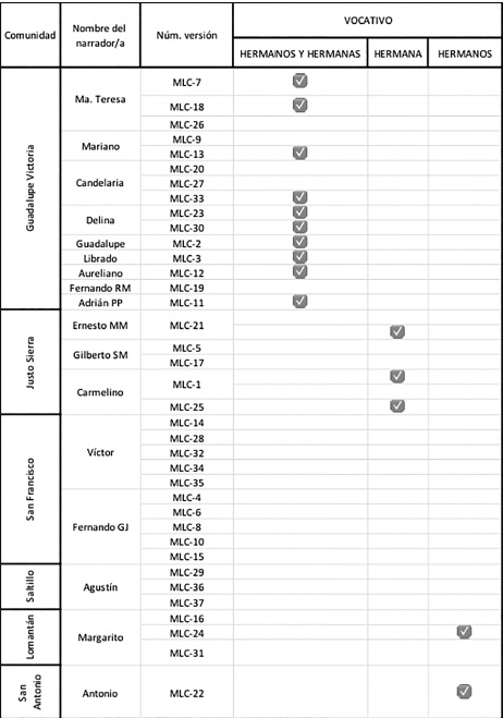 Uno de los elementos más frecuentes de la estructura formulística de apertura es el uso del vocativo para llamar la atención del público. Los narradores abren la estructura formulística con este elemento en 15 de las 37 versiones aquí analizadas y lo hacen utilizando siempre la palabra de origen castellano “hermano”, “hermana”, en diferentes formas. Este término se utiliza en tojolabal para dirigirse cordialmente a personas con las que no se tiene relación de consanguineidad en un trato de respeto fuera del ámbito doméstico.6