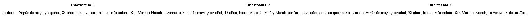 En este trabajo presento los saberes de los tres entrevistados acerca de la jach y el xe’ek' maya, debido a que sus respuestas fueron las más fluidas y ricas acerca del tema en cuestión. Las edades disímiles no fueron un factor para ser seleccionados, sino el tipo de respuestas expresadas. Además, complementan con mayor profundidad el tema en comparación de las respuestas más breves, proporcionadas por los informantes del segundo instrumento que guía el estudio. Presentamos breves características de cada uno de ellos: