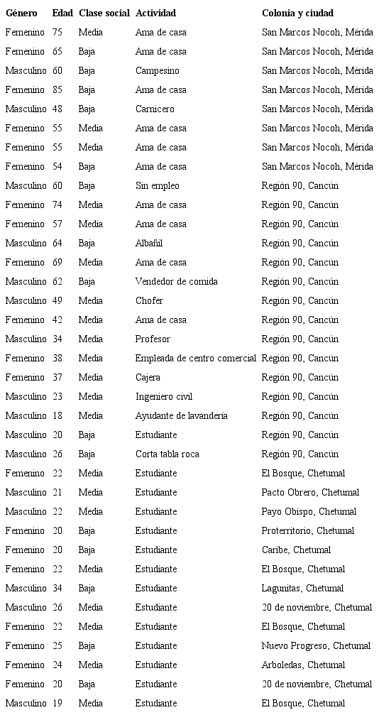 Para la obtención de los datos se usaron los siguientes instrumentos: el primero fue la entrevista semidirigida, aplicada en el 2009, en tres informantes que refieren ampliamente el tema de la maya verdadera y la maya mezclada. Los participantes forman parte de un grupo más amplio en el que se aplicaron entrevistas durante dicho año. Como resultado del análisis, se identificaron las actitudes hacia la lengua maya a través de categorías más amplias: 1. La maya verdadera y la maya mezclada en el tiempo y 2. Identidad y espacio de la jach maya.