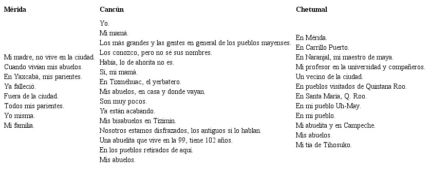 Los participantes del estudio de Cancún refieren representaciones heterogéneas acerca de quién habla la maya verdadera al expresar frases como: “yo”, “los más grandes”, “el yerbatero”, “los conozco, pero no sé sus nombres”, “había, lo de ahorita no es”, “son muy pocos”, “ya están acabando”, “los antiguos sí lo hablan”, “una abuelita”, “mis bisabuelos”. Pero coinciden, predominantemente, con los de Mérida en que los que hablan la maya legítima pertenecen a generaciones anteriores, son parte de un pasado que ahora se encuentra en extinción o está por desaparecer. Además, resalta en los testimonios que dos informantes de ambas ciudades aseguraron que son ellos los que hablan la maya verdadera.