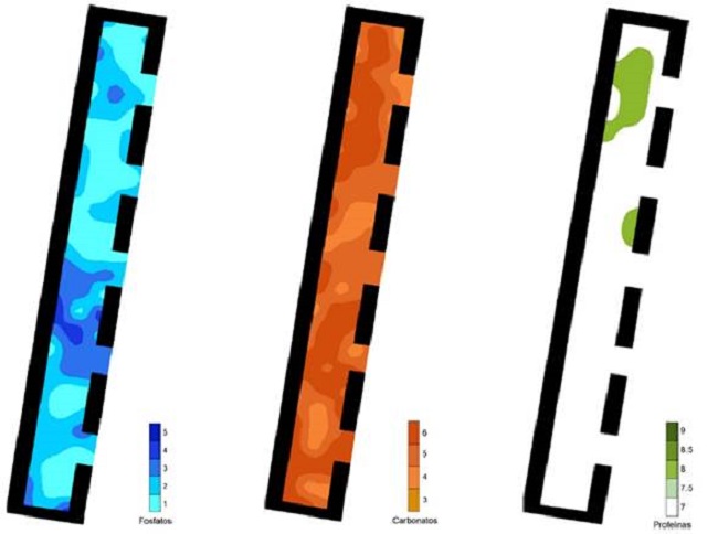 Los valores más altos de residuos proteicos se encuentran acumulados en forma de bandas en las orillas oriente y poniente del cuarto, dejando prácticamente un pasillo sin rastro de proteínas al centro de ellas (Figura 25). Las dimensiones del cuarto son demasiado pequeñas, de 2 x 2 m, por lo que podría tratarse de un lugar destinado al almacenamiento de bienes, en particular de alimentos de origen animal.